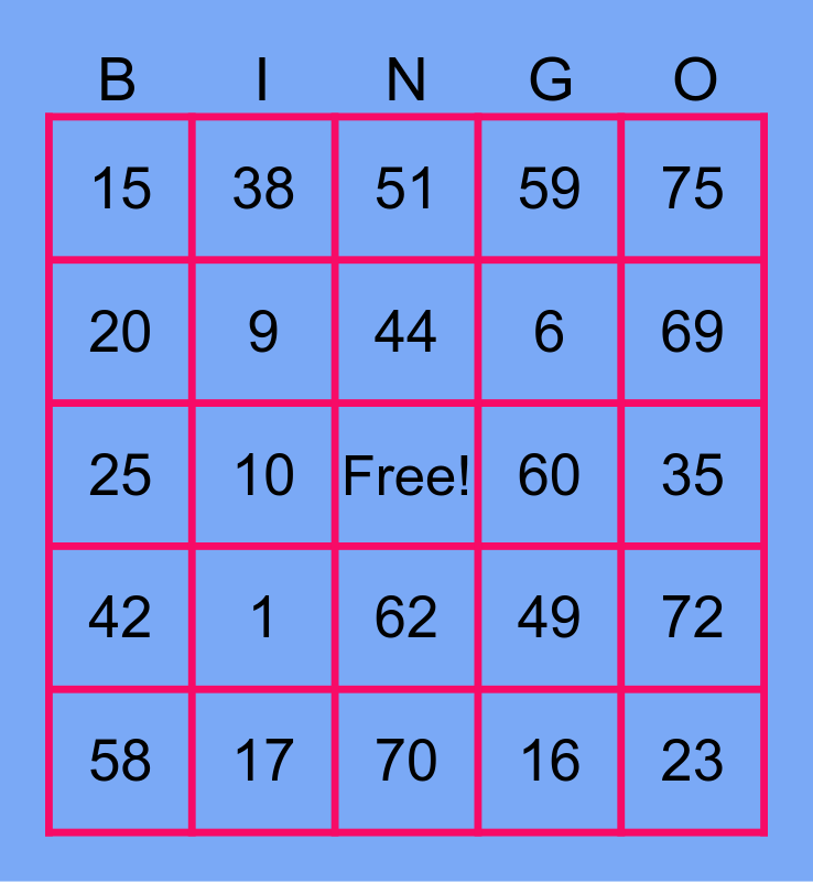 This bingo card has a free space and 24 words: 1, 17, 44, 58, 75, 15, 20, 38, 60, 62, 6, 25, 49, 72, 9, 16, 35, 51, 69, 10, 23, 42, 59 and 70.