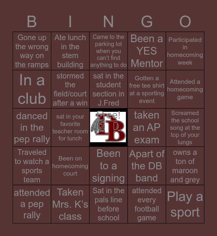 This bingo card has a free space and 24 words: attended a pep rally, Been on homecoming court, sat in the student section in J.Fred, attended every football game, Participated in homecoming week, Gone up the wrong way on the ramps, Ate lunch in the stem building, Came to the parking lot when you can’t find anything to do, taken an AP exam, Screamed the school song at the top of your lungs, danced in the pep rally, stormed the field/court after a win, Apart of the DB band, owns a ton of maroon and grey, In a club, Taken Mrs. K’s class, Sat in the pals line before school, Been a YES Mentor, Attended a homecoming game, Traveled to watch a sports team, sat in your favorite teacher room for lunch, Been to a signing, Gotten a free tee shirt at a sporting event and Play a sport.
