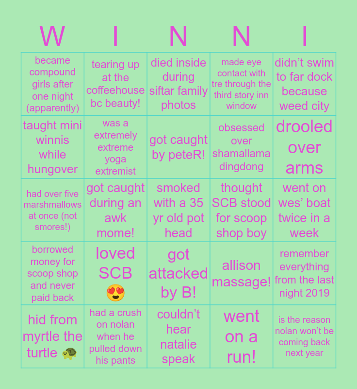 This bingo card has a free space and 24 words: loved SCB 😍, had a crush on nolan when he pulled down his pants, got caught by peteR!, hid from myrtle the turtle 🐢, didn’t swim to far dock because weed city, became compound girls after one night (apparently), taught mini winnis while hungover, tearing up at the coffeehouse bc beauty!, thought SCB stood for scoop shop boy, got attacked by B!, obsessed over shamallama dingdong, had over five marshmallows at once (not smores!), allison massage!, remember everything from the last night 2019, was a extremely extreme yoga extremist, went on a run!, went on wes’ boat twice in a week, died inside during siftar family photos, drooled over arms, got caught during an awk mome!, is the reason nolan won’t be coming back next year, borrowed money for scoop shop and never paid back, made eye contact with tre through the third story inn window and couldn’t hear natalie speak.