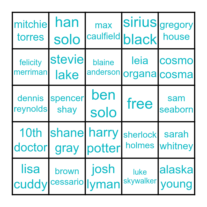 This bingo card has 25 words: shane gray, josh lyman, blaine anderson, lisa cuddy, gregory house, mitchie torres, felicity merriman, han solo, free, harry potter, leia organa, dennis reynolds, sherlock holmes, sarah whitney, stevie lake, alaska young, sam seaborn, max caulfield, cosmo cosma, spencer shay, ben solo, brown cessario, 10th doctor, sirius black and luke skywalker.