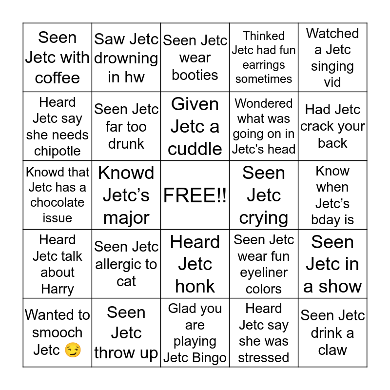 This bingo card has a free space and 24 words: Seen Jetc allergic to cat, Seen Jetc throw up, Given Jetc a cuddle, Wanted to smooch Jetc đ, Watched a Jetc singing vid, Seen Jetc with coffee, Heard Jetc say she needs chipotle, Saw Jetc drowning in hw, Seen Jetc crying, Heard Jetc honk, Wondered what was going on in Jetcâs head, Knowd that Jetc has a chocolate issue, Seen Jetc wear fun eyeliner colors, Seen Jetc in a show, Seen Jetc far too drunk, Heard Jetc say she was stressed, Know when Jetcâs bday is, Seen Jetc wear booties, Had Jetc crack your back, Knowd Jetcâs major, Seen Jetc drink a claw, Heard Jetc talk about Harry, Thinked Jetc had fun earrings sometimes and Glad you are playing Jetc Bingo.