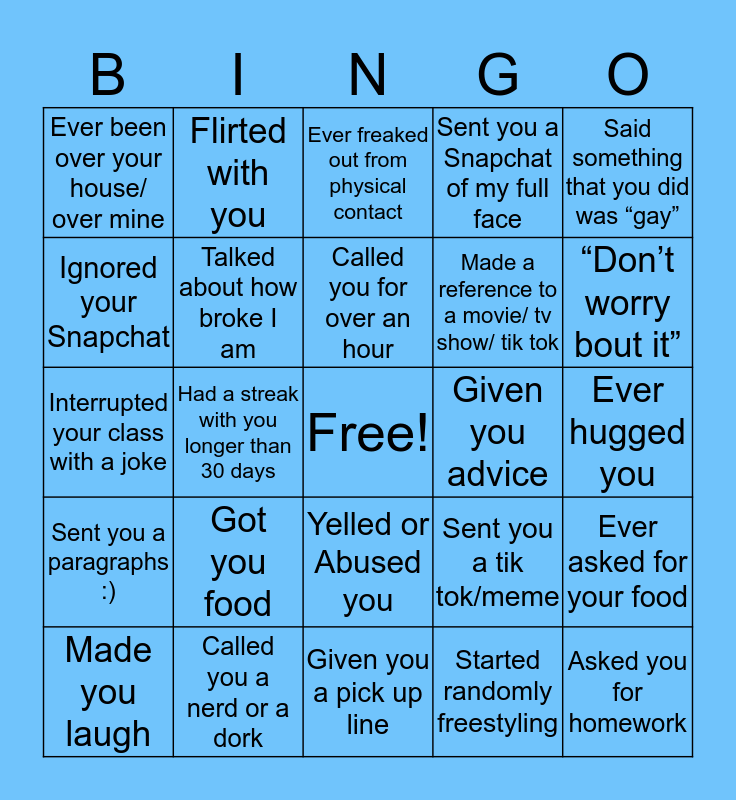 This bingo card has a free space and 24 words: Got you food, Called you a nerd or a dork, Called you for over an hour, Made you laugh, Said something that you did was “gay”, Ever been over your house/ over mine, Ignored your Snapchat, Flirted with you, Given you advice, Yelled or Abused you, Made a reference to a movie/ tv show/ tik tok, Interrupted your class with a joke, Sent you a tik tok/meme, Ever asked for your food, Talked about how broke I am, Started randomly freestyling, Ever hugged you, Ever freaked out from physical contact, “Don’t worry bout it”, Had a streak with you longer than 30 days, Asked you for homework, Sent you a paragraphs :), Sent you a Snapchat of my full face and Given you a pick up line.