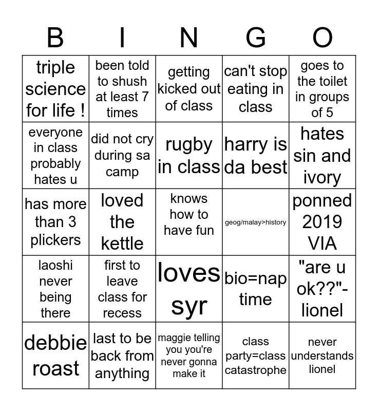 This bingo card has a free space and 24 words: first to leave class for recess, last to be back from anything, rugby in class, debbie roast, goes to the toilet in groups of 5, triple science for life !, everyone in class probably hates u, been told to shush at least 7 times, geog/malay>history, loves syr, harry is da best, has more than 3 plickers, bio=nap time, "are u ok??"-lionel, did not cry during sa camp, class party=class catastrophe, ponned 2019 VIA, getting kicked out of class, hates sin and ivory, loved the kettle, never understands lionel, laoshi never being there, can't stop eating in class and maggie telling you you're never gonna make it.
