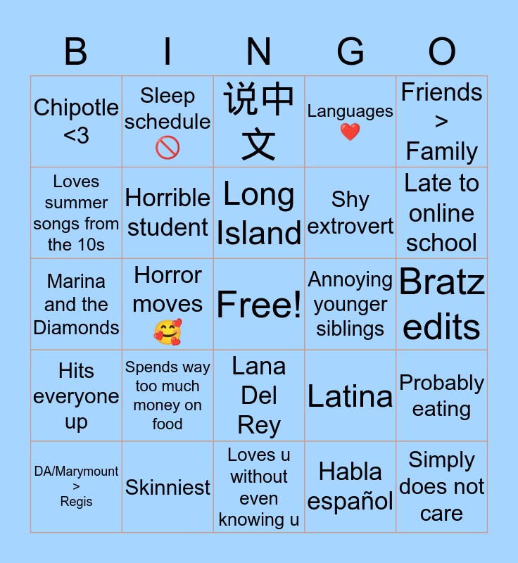 This bingo card has a free space and 24 words: Spends way too much money on food, Skinniest, Long Island, DA/Marymount > Regis, Friends > Family, Chipotle <3, Loves summer songs from the 10s, Sleep schedule 🚫, Annoying younger siblings, Lana Del Rey, Shy extrovert, Marina and the Diamonds, Latina, Probably eating, Horrible student, Habla español, Bratz edits, 说中文, Late to online school, Horror moves 🥰, Simply does not care, Hits everyone up, Languages ❤️ and Loves u without even knowing u.