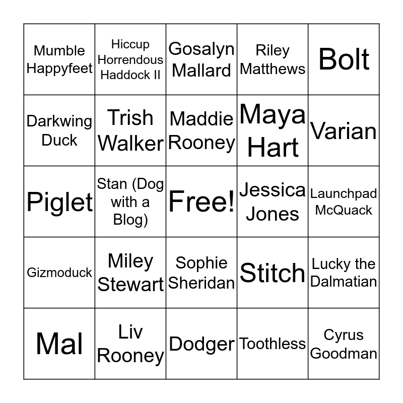 This bingo card has a free space and 24 words: Miley Stewart, Liv Rooney, Maddie Rooney, Mal, Bolt, Mumble Happyfeet, Darkwing Duck, Hiccup Horrendous Haddock II, Jessica Jones, Sophie Sheridan, Maya Hart, Piglet, Stitch, Lucky the Dalmatian, Trish Walker, Toothless, Launchpad McQuack, Gosalyn Mallard, Varian, Stan (Dog with a Blog), Cyrus Goodman, Gizmoduck, Riley Matthews and Dodger.