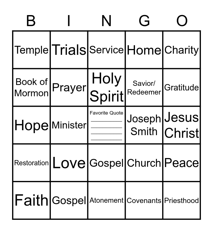 This bingo card has a free space and 29 words: Faith, Testimony, Minister, Family, Temple, Service, Prayer, Love, Joseph Smith, Gospel, Jesus Christ, Priesthood, Atonement, Covenants, Gratitude, Missionary, Gospel, Restoration, Charity, Hope, Church, Lord, Savior/ Redeemer, Book of Mormon, Home, Trials, Peace, Holy Spirit and Second Coming.