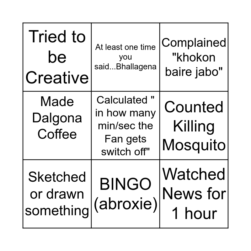This bingo card has a free space and 8 words: Counted Killing Mosquito, Complained "khokon baire jabo", At least one time you said...Bhallagena, Sketched or drawn something, Tried to be Creative, Watched News for 1 hour, Made Dalgona Coffee and BINGO (abroxie).