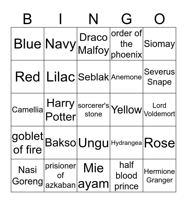 This bingo card has 25 words: Bakso, Mie ayam, Seblak, Nasi Goreng, Siomay, Blue, Red, Navy, Yellow, Ungu, Anemone, Camellia, Hydrangea, Rose, Lilac, Hermione Granger, Lord Voldemort, Draco Malfoy, Severus Snape, Harry Potter, sorcerer's stone, prisioner of azkaban, goblet of fire, order of the phoenix and half blood prince.