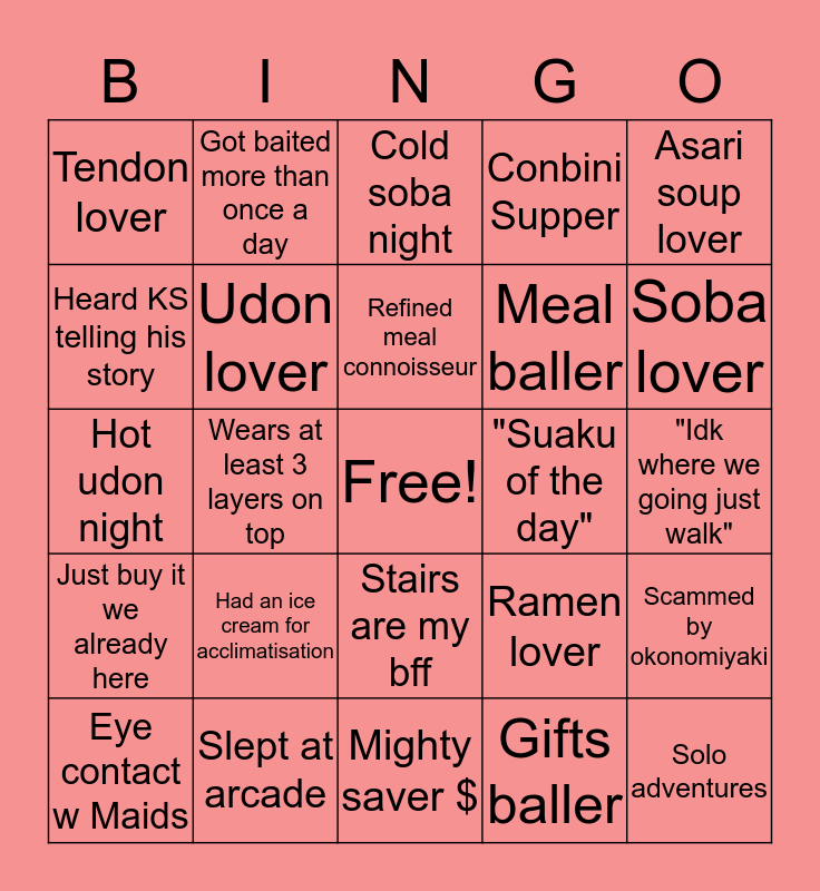 This bingo card has a free space and 24 words: Had an ice cream for acclimatisation, Slept at arcade, Refined meal connoisseur, Eye contact w Maids, Asari soup lover, Tendon lover, Heard KS telling his story, Got baited more than once a day, "Suaku of the day", Stairs are my bff, Meal baller, Hot udon night, Ramen lover, Scammed by okonomiyaki, Udon lover, Gifts baller, "Idk where we going just walk", Cold soba night, Soba lover, Wears at least 3 layers on top, Solo adventures, Just buy it we already here, Conbini Supper and Mighty saver $.
