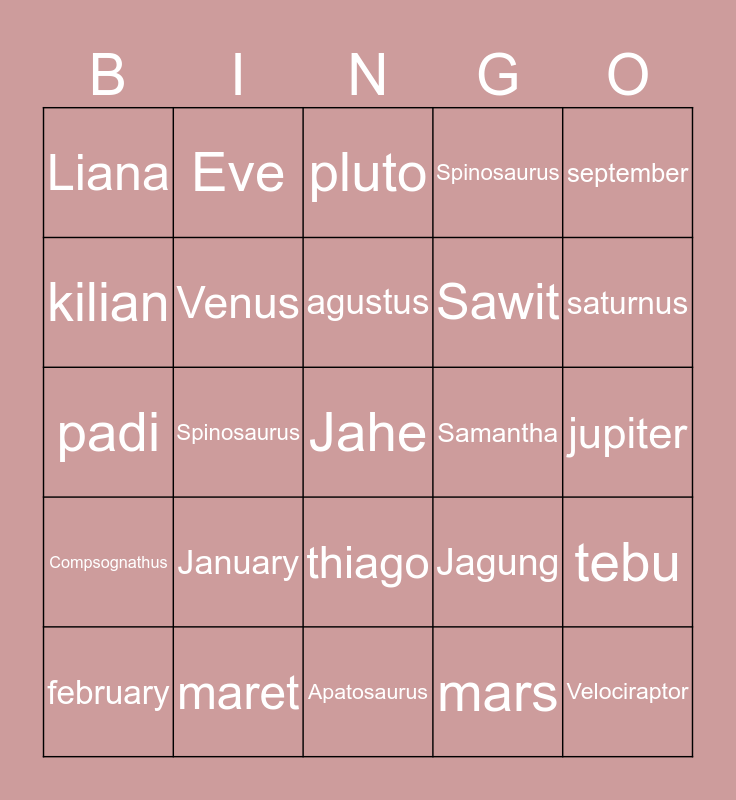 This bingo card has a free space and 24 words: January, maret, agustus, february, september, Liana, kilian, Eve, Samantha, thiago, Sawit, padi, Jagung, tebu, Venus, mars, jupiter, pluto, saturnus, Spinosaurus, Velociraptor, Compsognathus, Spinosaurus and Apatosaurus.