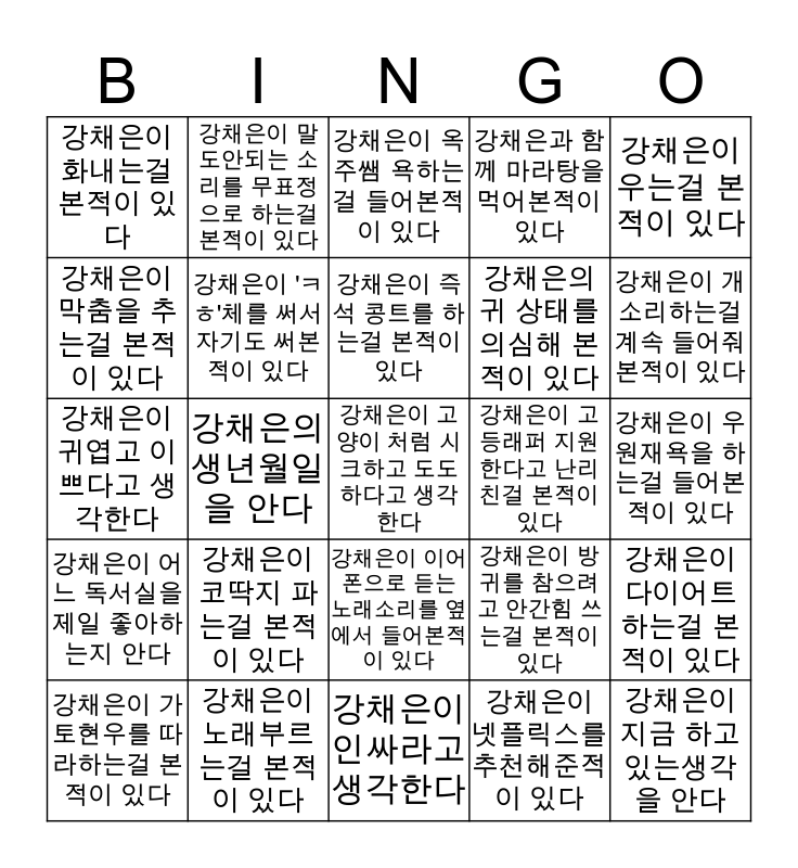 This bingo card has a free space and 24 words: ๊ฐ์ฑ์์ด ์ฝ๋ฑ์ง ํ๋๊ฑธ ๋ณธ์ ์ด ์๋ค, ๊ฐ์ฑ์์ด ๋ ธ๋๋ถ๋ฅด๋๊ฑธ ๋ณธ์ ์ด ์๋ค, ๊ฐ์ฑ์์ด ์ฆ์ ์ฝฉํธ๋ฅผ ํ๋๊ฑธ ๋ณธ์ ์ด ์๋ค, ๊ฐ์ฑ์์ด ๊ฐํ ํ์ฐ๋ฅผ ๋ฐ๋ผํ๋๊ฑธ ๋ณธ์ ์ด ์๋ค, ๊ฐ์ฑ์์ด ์ฐ๋๊ฑธ ๋ณธ์ ์ด ์๋ค, ๊ฐ์ฑ์์ด ํ๋ด๋๊ฑธ ๋ณธ์ ์ด ์๋ค, ๊ฐ์ฑ์์ด ๋ง์ถค์ ์ถ๋๊ฑธ ๋ณธ์ ์ด ์๋ค, ๊ฐ์ฑ์์ด ๋ง๋์๋๋ ์๋ฆฌ๋ฅผ ๋ฌดํ์ ์ผ๋ก ํ๋๊ฑธ ๋ณธ์ ์ด ์๋ค, ๊ฐ์ฑ์์ด ๊ณ ๋ฑ๋ํผ ์ง์ํ๋ค๊ณ ๋๋ฆฌ์น๊ฑธ ๋ณธ์ ์ด ์๋ค, ๊ฐ์ฑ์์ด ์ด์ดํฐ์ผ๋ก ๋ฃ๋ ๋ ธ๋์๋ฆฌ๋ฅผ ์์์ ๋ค์ด๋ณธ์ ์ด ์๋ค, ๊ฐ์ฑ์์ ๊ท ์ํ๋ฅผ ์์ฌํด ๋ณธ์ ์ด ์๋ค, ๊ฐ์ฑ์์ด ๊ท์ฝ๊ณ ์ด์๋ค๊ณ ์๊ฐํ๋ค, ๊ฐ์ฑ์์ด ๋ฐฉ๊ท๋ฅผ ์ฐธ์ผ๋ ค๊ณ ์๊ฐํ ์ฐ๋๊ฑธ ๋ณธ์ ์ด ์๋ค, ๊ฐ์ฑ์์ด ๋ค์ด์ดํธํ๋๊ฑธ ๋ณธ์ ์ด ์๋ค, ๊ฐ์ฑ์์ด 'ใ ใ '์ฒด๋ฅผ ์จ์ ์๊ธฐ๋ ์จ๋ณธ์ ์ด ์๋ค, ๊ฐ์ฑ์์ด ๋ทํ๋ฆญ์ค๋ฅผ ์ถ์ฒํด์ค์ ์ด ์๋ค, ๊ฐ์ฑ์์ด ์ฐ์์ฌ์์ ํ๋๊ฑธ ๋ค์ด๋ณธ์ ์ด ์๋ค, ๊ฐ์ฑ์์ด ์ฅ์ฃผ์ค ์ํ๋๊ฑธ ๋ค์ด๋ณธ์ ์ด ์๋ค, ๊ฐ์ฑ์์ด ๊ฐ์๋ฆฌํ๋๊ฑธ ๊ณ์ ๋ค์ด์ค๋ณธ์ ์ด ์๋ค, ๊ฐ์ฑ์์ ์๋ ์์ผ์ ์๋ค, ๊ฐ์ฑ์์ด ์ง๊ธ ํ๊ณ ์๋์๊ฐ์ ์๋ค, ๊ฐ์ฑ์์ด ์ด๋ ๋ ์์ค์ ์ ์ผ ์ข์ํ๋์ง ์๋ค, ๊ฐ์ฑ์๊ณผ ํจ๊ป ๋ง๋ผํ์ ๋จน์ด๋ณธ์ ์ด ์๋ค and ๊ฐ์ฑ์์ด ์ธ์ธ๋ผ๊ณ ์๊ฐํ๋ค.