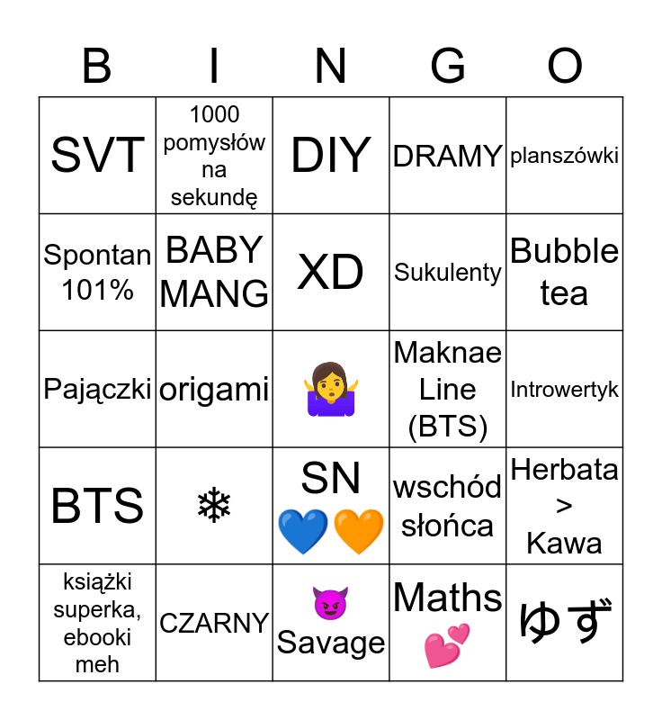 This bingo card has a free space and 24 words: ❄, CZARNY, XD, książki superka, ebooki meh, planszówki, SVT, Spontan 101%, 1000 pomysłów na sekundę, Maknae Line (BTS), SN💙🧡, Sukulenty, Pajączki, wschód słońca, Herbata > Kawa, BABY MANG, Maths 💕, Introwertyk, DIY, Bubble tea, origami, ゆず, BTS, DRAMY and 😈 Savage.
