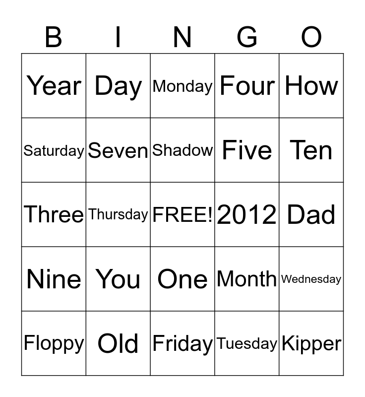 This bingo card has a free space and 24 words: You, Old, Shadow, Floppy, How, Year, Saturday, Day, 2012, One, Five, Three, Month, Wednesday, Seven, Tuesday, Dad, Monday, Ten, Thursday, Kipper, Nine, Four and Friday.