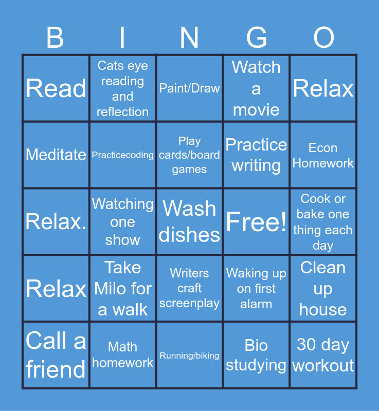 This bingo card has a free space and 24 words: Take Milo for a walk, Math homework, Play cards/board games, Call a friend, Relax, Read, Meditate, Cats eye reading and reflection, Free!, Writers craft screenplay, Practice writing, Relax., Waking up on first alarm, Clean up house, Practicecoding, Bio studying, Cook or bake one thing each day, Paint/Draw, Econ Homework, Watching one show, 30 day workout, Relax, Watch a movie and Running/biking.