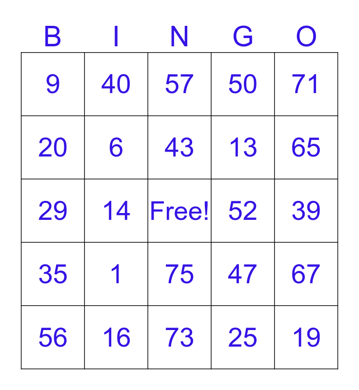 This bingo card has a free space and 24 words: 1, 16, 43, 56, 71, 9, 20, 40, 52, 75, 13, 29, 47, 67, 6, 25, 39, 57, 65, 14, 19, 35, 50 and 73.
