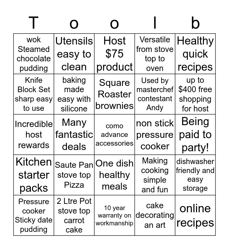 This bingo card has a free space and 24 words: Saute Pan stove top Pizza, 2 Ltre Pot stove top carrot cake, Square Roaster brownies, Pressure cooker Sticky date pudding, Healthy quick recipes, wok Steamed chocolate pudding, Knife Block Set sharp easy to use, Utensils easy to clean, non stick pressure cooker, One dish healthy meals, Used by masterchef contestant Andy, Incredible host rewards, Making cooking simple and fun, dishwasher friendly and easy storage, baking made easy with silicone, cake decorating an art, Being paid to party!, Host $75 product, up to $400 free shopping for host, Many fantastic deals, online recipes, Kitchen starter packs, Versatile from stove top to oven and 10 year warranty on workmanship.