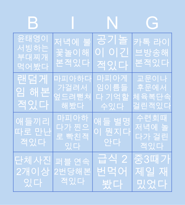 This bingo card has 16 words: 퍼블 연속 2번당해본적있다, 수련회때 저녁에 놀다가 걸린적있다, 공기놀이 이긴적있다, 윤태영이 서빙하는 부대찌개먹어봤다, 애들끼리 따로 만난적있다, 저녁에 불꽃놀이해본적있다, 애들 별명이 뭔지다안다, 급식 2번먹어봤다, 랜덤게임 해본적있다, 마피아하다가걸려서 엎드려뻗쳐해봤다, 단체사진 2개이상있다, 카톡 라이브방송해본적있다, 마피아하다가 찐으로 빡친적있다, 교문이나 후문에서 체육복단속 걸린적있다, 마피아게임이름들 다 기억할수있다 and 중3때가제일 재밌었다.