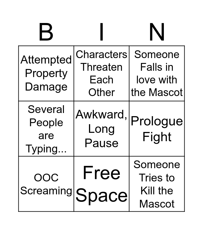 This bingo card has a free space and 8 words: Prologue Fight, Someone Falls in love with the Mascot, Characters Threaten Each Other, OOC Screaming, Attempted Property Damage, Someone Tries to Kill the Mascot, Several People are Typing... and Free Space.