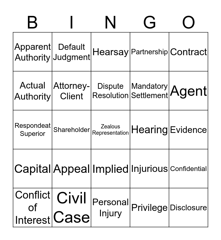 This bingo card has a free space and 24 words: Appeal, Civil Case, Dispute Resolution, Conflict of Interest, Contract, Apparent Authority, Actual Authority, Default Judgment, Hearing, Implied, Mandatory Settlement, Respondeat Superior, Injurious, Confidential, Attorney-Client, Privilege, Evidence, Hearsay, Agent, Shareholder, Disclosure, Capital, Partnership and Personal Injury.
