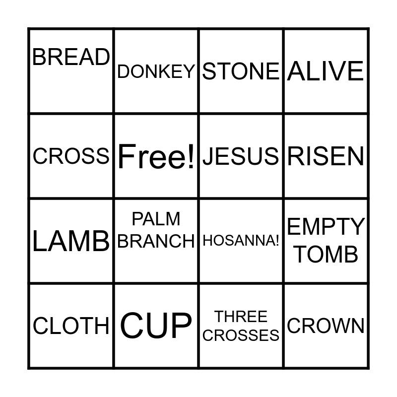 This bingo card has 20 words: EMPTY TOMB, MARY, STONE, ANGEL, CLOTH, CROSS, CUP, BREAD, LAMB, DONKEY, PALM BRANCH, HOSANNA!, Free!, CROWN, JESUS, SOLIDER, RISEN, ALIVE, THREE CROSSES and FORGIVE THEM.