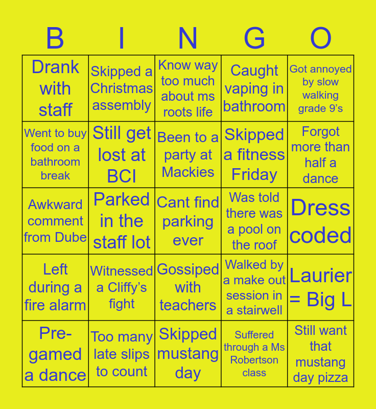 This bingo card has a free space and 24 words: Witnessed a Cliffy’s fight, Too many late slips to count, Been to a party at Mackies, Pre-gamed a dance, Got annoyed by slow walking grade 9’s, Drank with staff, Went to buy food on a bathroom break, Skipped a Christmas assembly, Was told there was a pool on the roof, Gossiped with teachers, Skipped a fitness Friday, Awkward comment from Dube, Walked by a make out session in a stairwell, Laurier = Big L, Still get lost at BCI, Suffered through a Ms Robertson class, Dress coded, Know way too much about ms roots life, Forgot more than half a dance, Parked in the staff lot, Still want that mustang day pizza, Left during a fire alarm, Caught vaping in bathroom and Skipped mustang day.