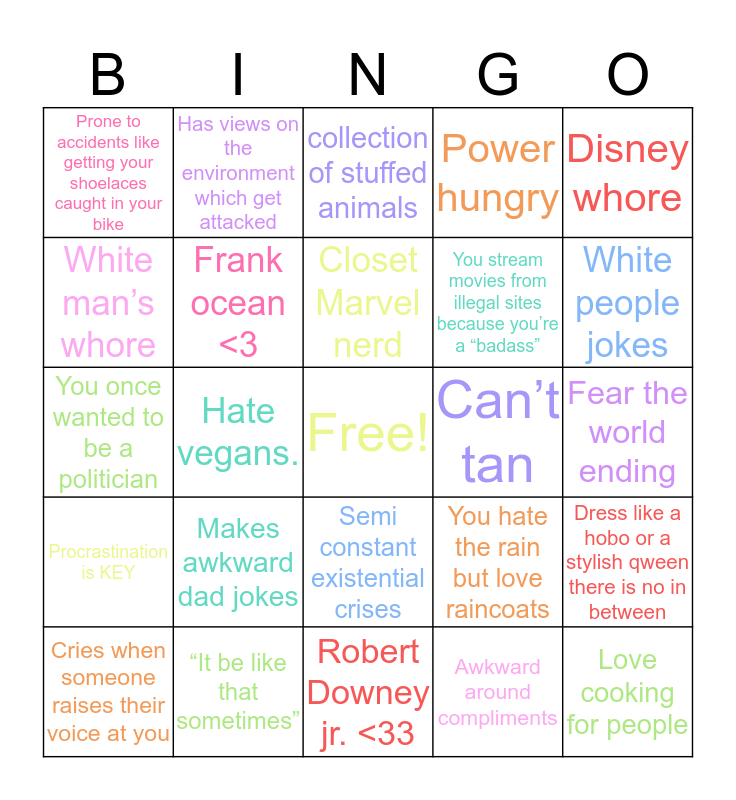This bingo card has a free space and 24 words: Makes awkward dad jokes, “It be like that sometimes”, Closet Marvel nerd, Cries when someone raises their voice at you, Disney whore, Prone to accidents like getting your shoelaces caught in your bike, White man’s whore, Has views on the environment which get attacked, Can’t tan, Semi constant existential crises, You stream movies from illegal sites because you’re a “badass”, You once wanted to be a politician, You hate the rain but love raincoats, Dress like a hobo or a stylish qween there is no in between, Frank ocean <3, Awkward around compliments, Fear the world ending, collection of stuffed animals, White people jokes, Hate vegans., Love cooking for people, Procrastination is KEY, Power hungry and Robert Downey jr. <33.