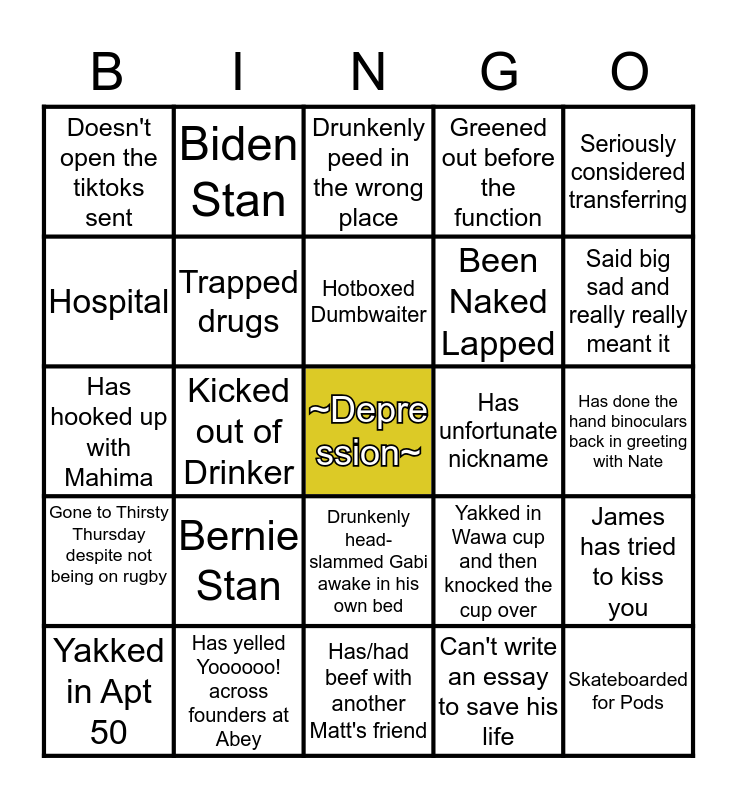 This bingo card has a free space and 24 words: Yakked in Apt 50, Bernie Stan, Hotboxed Dumbwaiter, Can't write an essay to save his life, Seriously considered transferring, Doesn't open the tiktoks sent, Biden Stan, Drunkenly peed in the wrong place, Has unfortunate nickname, Has done the hand binoculars back in greeting with Nate, Has hooked up with Mahima, Trapped drugs, Yakked in Wawa cup and then knocked the cup over, James has tried to kiss you, Hospital, Has yelled Yoooooo! across founders at Abey, Has/had beef with another Matt's friend, Greened out before the function, Said big sad and really really meant it, Gone to Thirsty Thursday despite not being on rugby, Kicked out of Drinker, Drunkenly head-slammed Gabi awake in his own bed, Been Naked Lapped and Skateboarded for Pods.