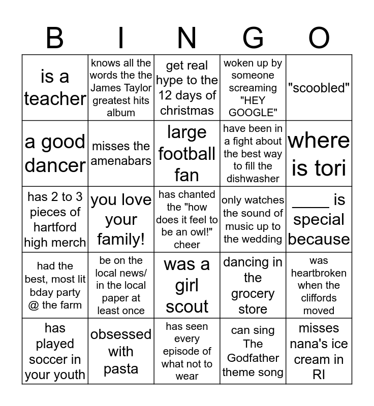 This bingo card has a free space and 24 words: be on the local news/ in the local paper at least once, obsessed with pasta, large football fan, has played soccer in your youth, "scoobled", is a teacher, a good dancer, knows all the words the the James Taylor greatest hits album, only watches the sound of music up to the wedding, was a girl scout, have been in a fight about the best way to fill the dishwasher, has 2 to 3 pieces of hartford high merch, dancing in the grocery store, was heartbroken when the cliffords moved, misses the amenabars, can sing The Godfather theme song, ____ is special because, get real hype to the 12 days of christmas, where is tori, you love your family!, misses nana's ice cream in RI, had the best, most lit bday party @ the farm, woken up by someone screaming "HEY GOOGLE" and has seen every episode of what not to wear.