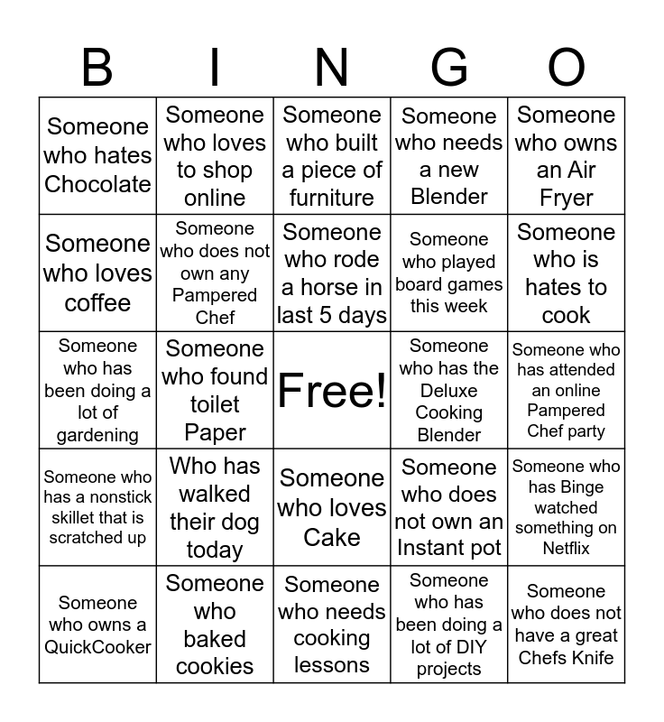 This bingo card has a free space and 24 words: Who has walked their dog today, Someone who baked cookies, Someone who rode a horse in last 5 days, Someone who owns a QuickCooker, Someone who owns an Air Fryer, Someone who hates Chocolate, Someone who loves coffee, Someone who loves to shop online, Someone who has the Deluxe Cooking Blender, Someone who loves Cake, Someone who played board games this week, Someone who has been doing a lot of gardening, Someone who does not own an Instant pot, Someone who has Binge watched something on Netflix, Someone who does not own any Pampered Chef, Someone who has been doing a lot of DIY projects, Someone who has attended an online Pampered Chef party, Someone who built a piece of furniture, Someone who is hates to cook, Someone who found toilet Paper, Someone who does not have a great Chefs Knife, Someone who has a nonstick skillet that is scratched up, Someone who needs a new Blender and Someone who needs cooking lessons.