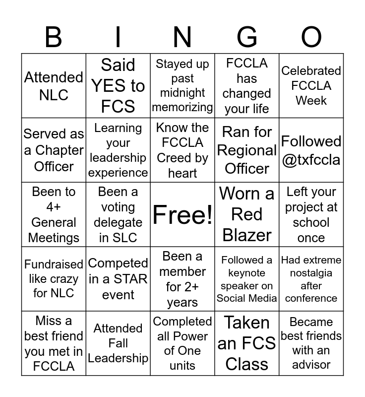 This bingo card has a free space and 24 words: Competed in a STAR event, Attended Fall Leadership, Know the FCCLA Creed by heart, Miss a best friend you met in FCCLA, Celebrated FCCLA Week, Attended NLC, Served as a Chapter Officer, Said YES to FCS, Worn a Red Blazer, Been a member for 2+ years, Ran for Regional Officer, Been to 4+ General Meetings, Followed a keynote speaker on Social Media, Had extreme nostalgia after conference, Learning your leadership experience, Taken an FCS Class, Left your project at school once, Stayed up past midnight memorizing, Followed @txfccla, Been a voting delegate in SLC, Became best friends with an advisor, Fundraised like crazy for NLC, FCCLA has changed your life and Completed all Power of One units.