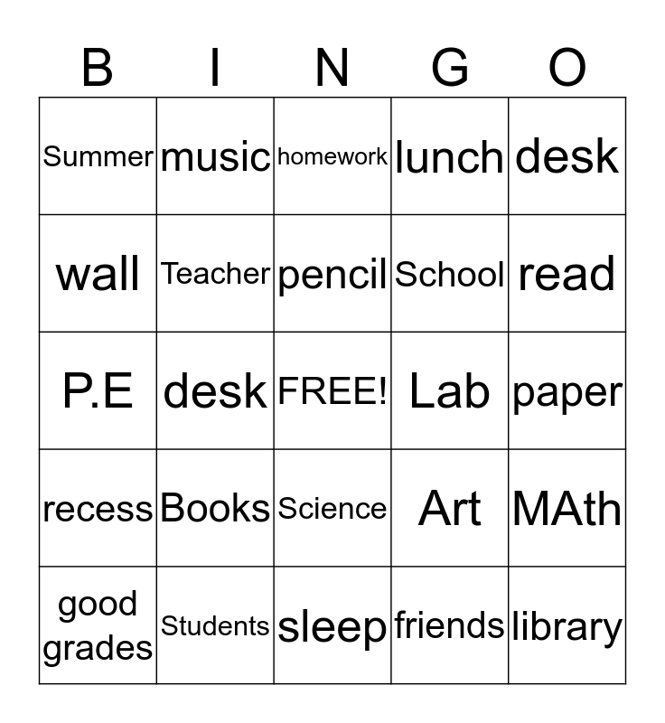 This bingo card has a free space and 24 words: Books, Students, pencil, good grades, desk, Summer, wall, music, Lab, Science, School, P.E, Art, MAth, Teacher, friends, paper, homework, read, desk, library, recess, lunch and sleep.