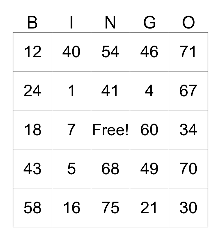 This bingo card has a free space and 24 words: 5, 16, 41, 58, 71, 12, 24, 40, 60, 68, 4, 18, 49, 70, 1, 21, 34, 54, 67, 7, 30, 43, 46 and 75.