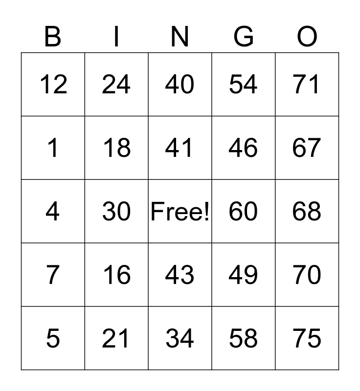 This bingo card has a free space and 24 words: 5, 16, 41, 58, 71, 12, 24, 40, 60, 68, 4, 18, 49, 70, 1, 21, 34, 54, 67, 7, 30, 43, 46 and 75.