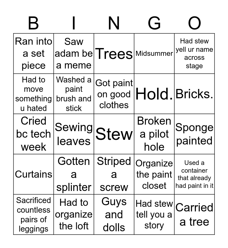 This bingo card has a free space and 24 words: Gotten a splinter, Had to organize the loft, Got paint on good clothes, Sacrificed countless pairs of leggings, Had stew yell ur name across stage, Ran into a set piece, Had to move something u hated, Saw adam be a meme, Broken a pilot hole, Striped a screw, Hold., Cried bc tech week, Organize the paint closet, Used a container that already had paint in it, Washed a paint brush and stick, Had stew tell you a story, Sponge painted, Trees, Bricks., Sewing leaves, Carried a tree, Curtains, Midsummer and Guys and dolls.