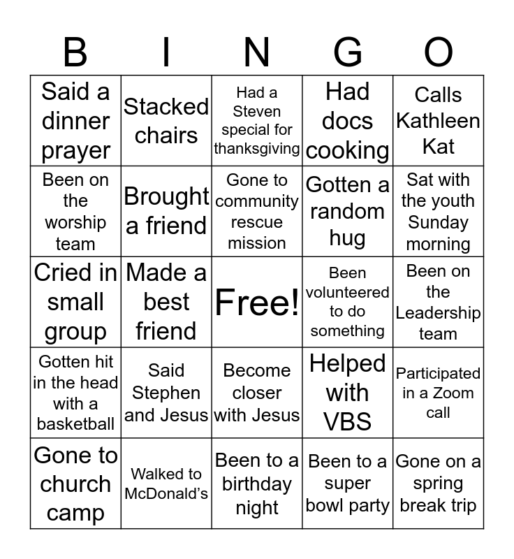 This bingo card has a free space and 24 words: Gone to church camp, Said Stephen and Jesus, Gone to community rescue mission, Been to a super bowl party, Calls Kathleen Kat, Said a dinner prayer, Stacked chairs, Had a Steven special for thanksgiving, Been volunteered to do something, Been on the Leadership team, Cried in small group, Brought a friend, Helped with VBS, Participated in a Zoom call, Been on the worship team, Walked to McDonald’s, Been to a birthday night, Had docs cooking, Sat with the youth Sunday morning, Gotten hit in the head with a basketball, Made a best friend, Become closer with Jesus, Gotten a random hug and Gone on a spring break trip.
