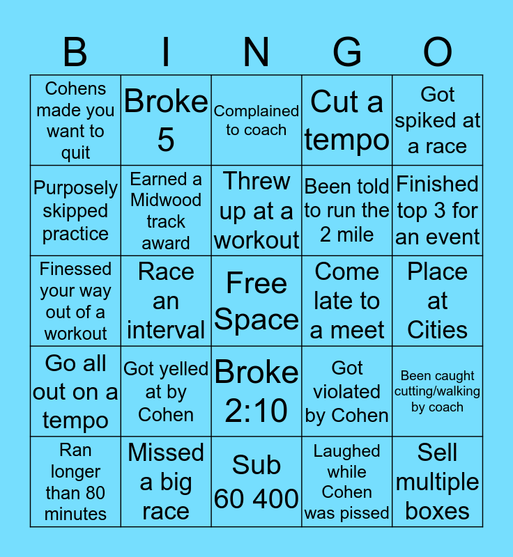 This bingo card has a free space and 24 words: Got yelled at by Cohen, Missed a big race, Threw up at a workout, Ran longer than 80 minutes, Got spiked at a race, Cohens made you want to quit, Purposely skipped practice, Broke 5, Come late to a meet, Broke 2:10, Been told to run the 2 mile, Finessed your way out of a workout, Got violated by Cohen, Been caught cutting/walking by coach, Earned a Midwood track award, Laughed while Cohen was pissed, Place at Cities, Complained to coach, Finished top 3 for an event, Race an interval, Sell multiple boxes, Go all out on a tempo, Cut a tempo and Sub 60 400.
