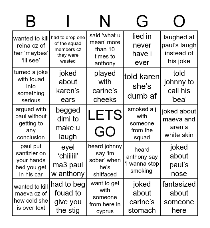 This bingo card has a free space and 24 words: eyel ‘chiiiiil’ ma3 paul w anthony, had to beg fouad to give you the stig, played with carine’s cheeks, wanted to kill maeva cz of how cold she is over text, laughed at paul’s laugh instead of his joke, wanted to kill reina cz of her ‘maybes’ ‘ill see’, turned a joke with fouad into something serious, had to drop one of the squad members cz they were wasted, smoked a j with someone from the squad, heard johnny say ‘im sober’ when he’s shitfaced, told karen she’s dumb af, argued with paul without getting to any conclusion, heard anthony say ‘i wanna stop smoking’, joked about paul’s nose, joked about karen’s ears, joked about carine’s stomach, joked about maeva and aren’s white skin, said ‘what u mean’ more than 10 times to anthony, told johnny to call his ‘bea’, begged dimi to make u laugh, fantasized about someone here, paul put santizier on your hands be4 you get in his car, lied in never have i ever and want to get with someone from here in cyprus.