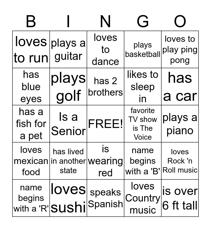 This bingo card has a free space and 24 words: has lived in another state, loves sushi, has 2 brothers, name begins with a 'R', loves to play ping pong, loves to run, has blue eyes, plays a guitar, favorite TV show is The Voice, is wearing red, likes to sleep in, has a fish for a pet, name begins with a 'B', loves Rock 'n Roll music, plays golf, loves Country music, plays a piano, loves to dance, has a car, Is a Senior, is over 6 ft tall, loves mexican food, plays basketball and speaks Spanish.