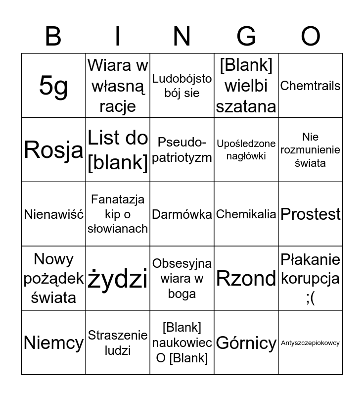 This bingo card has a free space and 24 words: żydzi, Straszenie ludzi, Pseudo-patriotyzm, Niemcy, Chemtrails, 5g, Rosja, Wiara w własną racje, Chemikalia, Obsesyjna wiara w boga, Upośledzone nagłówki, Nienawiść, Rzond, Płakanie korupcja ;(, List do [blank], Górnicy, Prostest, Ludobójsto bój sie, Nie rozmunienie świata, Fanatazja kip o słowianach, Antyszczepiokowcy, Nowy pożądek świata, [Blank] wielbi szatana and [Blank] naukowiec O [Blank].
