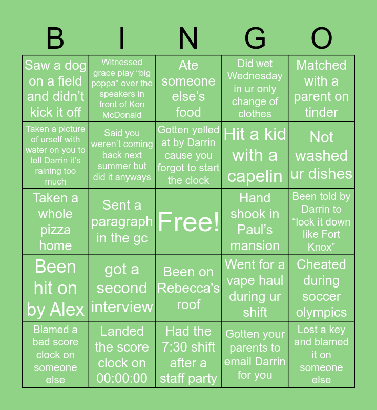 This bingo card has a free space and 24 words: got a second interview, Landed the score clock on 00:00:00, Gotten yelled at by Darrin cause you forgot to start the clock, Blamed a bad score clock on someone else, Matched with a parent on tinder, Saw a dog on a field and didn’t kick it off, Taken a picture of urself with water on you to tell Darrin it’s raining too much, Witnessed grace play “big poppa” over the speakers in front of Ken McDonald, Hand shook in Paul’s mansion, Been on Rebecca's roof, Hit a kid with a capelin, Taken a whole pizza home, Went for a vape haul during ur shift, Cheated during soccer olympics, Said you weren’t coming back next summer but did it anyways, Gotten your parents to email Darrin for you, Been told by Darrin to “lock it down like Fort Knox”, Ate someone else’s food, Not washed ur dishes, Sent a paragraph in the gc, Lost a key and blamed it on someone else, Been hit on by Alex, Did wet Wednesday in ur only change of clothes and Had the 7:30 shift after a staff party.