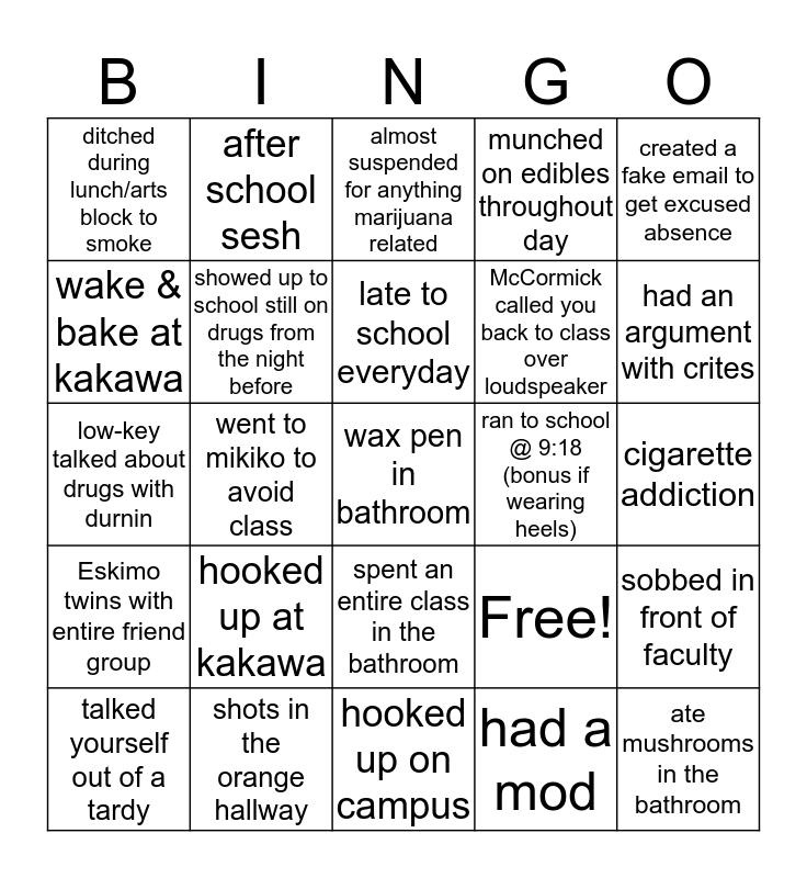 This bingo card has 25 words: hooked up at kakawa, hooked up on campus, late to school everyday, talked yourself out of a tardy, created a fake email to get excused absence, ditched during lunch/arts block to smoke, wake & bake at kakawa, after school sesh, ran to school @ 9:18 (bonus if wearing heels), spent an entire class in the bathroom, McCormick called you back to class over loudspeaker, low-key talked about drugs with durnin, Free!, sobbed in front of faculty, showed up to school still on drugs from the night before, ate mushrooms in the bathroom, cigarette addiction, almost suspended for anything marijuana related, had an argument with crites, went to mikiko to avoid class, wax pen in bathroom, shots in the orange hallway, Eskimo twins with entire friend group, munched on edibles throughout day and had a mod.