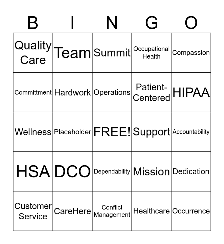 This bingo card has a free space and 24 words: DCO, CareHere, Operations, Customer Service, Compassion, Quality Care, Committment, Team, Support, Dependability, Patient-Centered, Wellness, Mission, Dedication, Hardwork, Healthcare, Accountability, Summit, HIPAA, Placeholder, Occurrence, HSA, Occupational Health and Conflict Management.