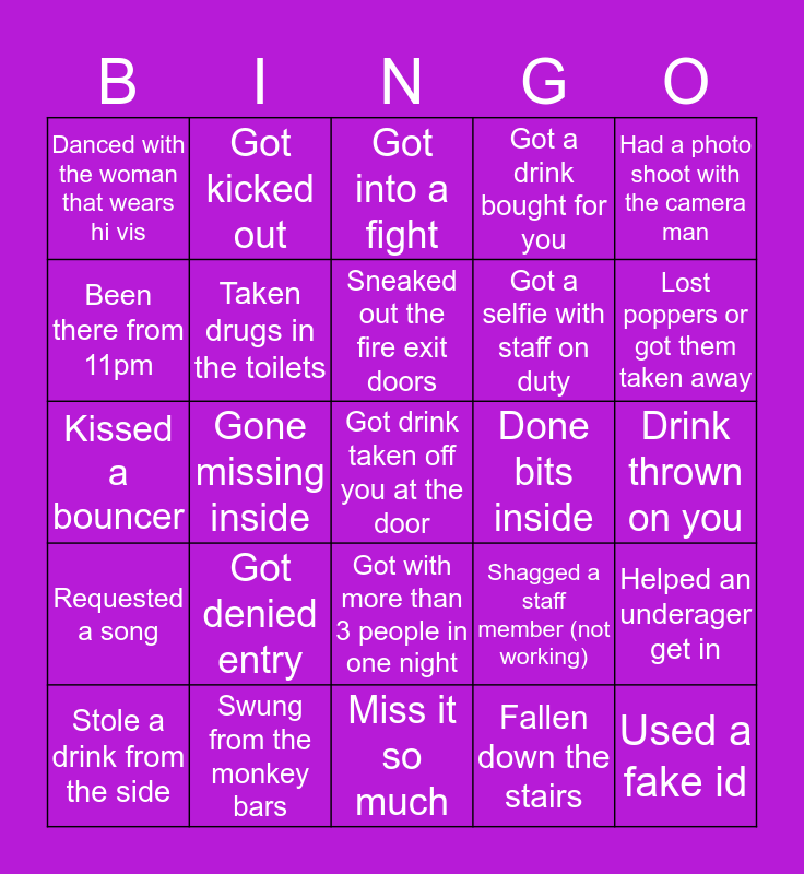 This bingo card has a free space and 24 words: Got denied entry, Swung from the monkey bars, Sneaked out the fire exit doors, Stole a drink from the side, Had a photo shoot with the camera man, Danced with the woman that wears hi vis, Been there from 11pm, Got kicked out, Done bits inside, Got with more than 3 people in one night, Got a selfie with staff on duty, Kissed a bouncer, Shagged a staff member (not working), Helped an underager get in, Taken drugs in the toilets, Fallen down the stairs, Drink thrown on you, Got into a fight, Lost poppers or got them taken away, Gone missing inside, Used a fake id, Requested a song, Got a drink bought for you and Miss it so much.