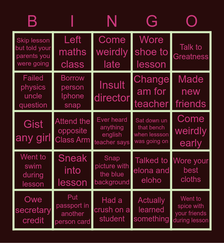 This bingo card has a free space and 24 words: Sneak into lesson, Put passport in another person card, Insult director, Owe secretary credit, Talk to Greatness, Skip lesson but told your parents you were going, Failed physics uncle question, Left maths class, Sat down un that bench when lessson was going on, Snap picture with the blue background, Change am for teacher, Gist any girl, Talked to elona and eloho, Wore your best cloths, Borrow person Iphone snap, Actually learned something, Come weirdly early, Come weirdly late, Made new friends, Attend the opposite Class Arm, Went to spice with your friends during lesson, Went to swim during lesson, Wore shoe to lesson and Had a crush on a student.