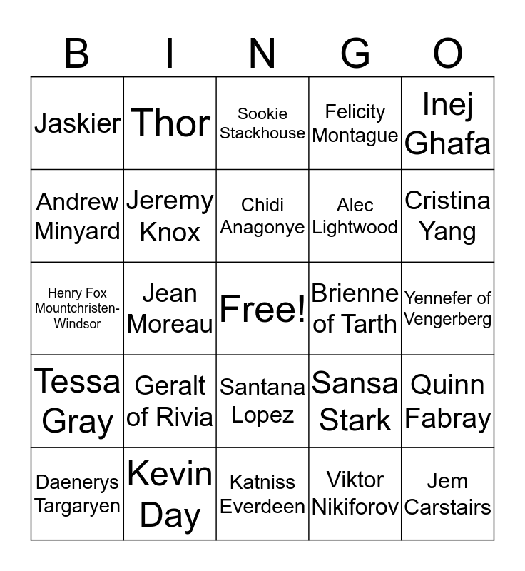 This bingo card has a free space and 24 words: Geralt of Rivia, Kevin Day, Chidi Anagonye, Daenerys Targaryen, Inej Ghafa, Jaskier, Andrew Minyard, Thor, Brienne of Tarth, Santana Lopez, Alec Lightwood, Henry Fox Mountchristen-Windsor, Sansa Stark, Quinn Fabray, Jeremy Knox, Viktor Nikiforov, Yennefer of Vengerberg, Sookie Stackhouse, Cristina Yang, Jean Moreau, Jem Carstairs, Tessa Gray, Felicity Montague and Katniss Everdeen.