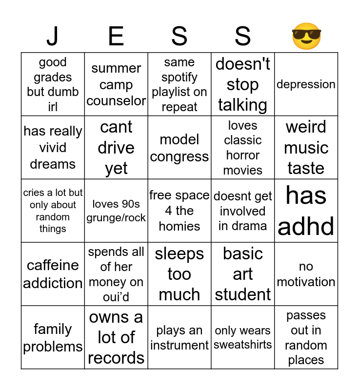 This bingo card has a free space and 24 words: family problems, spends all of her money on oui’d, model congress, only wears sweatshirts, depression, good grades but dumb irl, summer camp counselor, same spotify playlist on repeat, doesnt get involved in drama, has adhd, cries a lot but only about random things, cant drive yet, basic art student, no motivation, has really vivid dreams, owns a lot of records, plays an instrument, doesn't stop talking, weird music taste, caffeine addiction, loves 90s grunge/rock, sleeps too much, loves classic horror movies and passes out in random places.