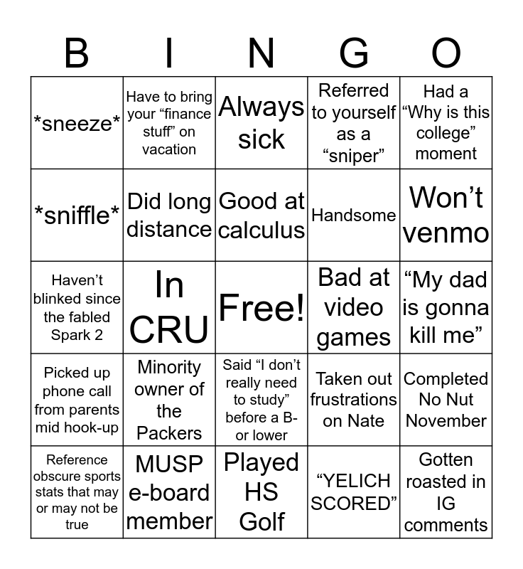 This bingo card has a free space and 24 words: Minority owner of the Packers, MUSP e-board member, Good at calculus, Reference obscure sports stats that may or may not be true, Had a “Why is this college” moment, *sneeze*, *sniffle*, Have to bring your “finance stuff” on vacation, Bad at video games, Said “I don’t really need to study” before a B- or lower, Handsome, Haven’t blinked since the fabled Spark 2, Taken out frustrations on Nate, Completed No Nut November, Did long distance, “YELICH SCORED”, “My dad is gonna kill me”, Always sick, Won’t venmo, In CRU, Gotten roasted in IG comments, Picked up phone call from parents mid hook-up, Referred to yourself as a “sniper” and Played HS Golf.