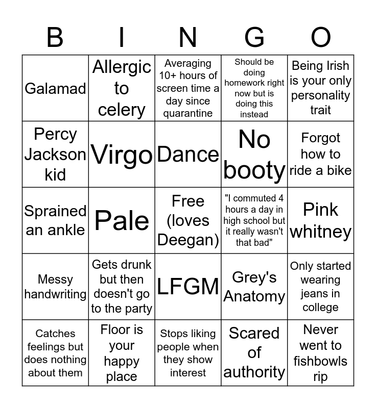 This bingo card has a free space and 24 words: Gets drunk but then doesn't go to the party, Floor is your happy place, Dance, Catches feelings but does nothing about them, Being Irish is your only personality trait, Galamad, Percy Jackson kid, Allergic to celery, "I commuted 4 hours a day in high school but it really wasn't that bad", LFGM, No booty, Sprained an ankle, Grey's Anatomy, Only started wearing jeans in college, Virgo, Scared of authority, Pink whitney, Averaging 10+ hours of screen time a day since quarantine, Forgot how to ride a bike, Pale, Never went to fishbowls rip, Messy handwriting, Should be doing homework right now but is doing this instead and Stops liking people when they show interest.