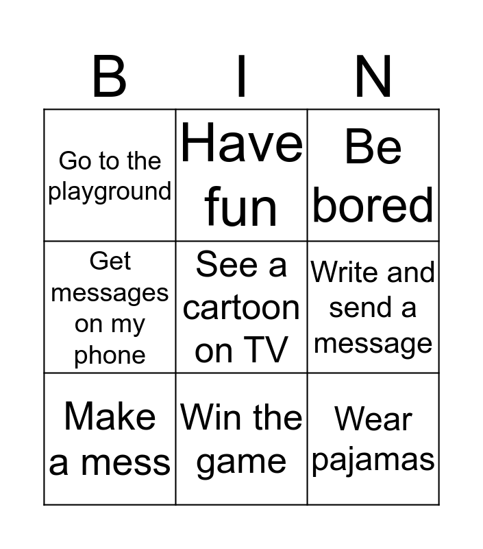 This bingo card has a free space and 8 words: Write and send a message, Be bored, Have fun, Make a mess, Go to the playground, Wear pajamas, Get messages on my phone and Win the game.
