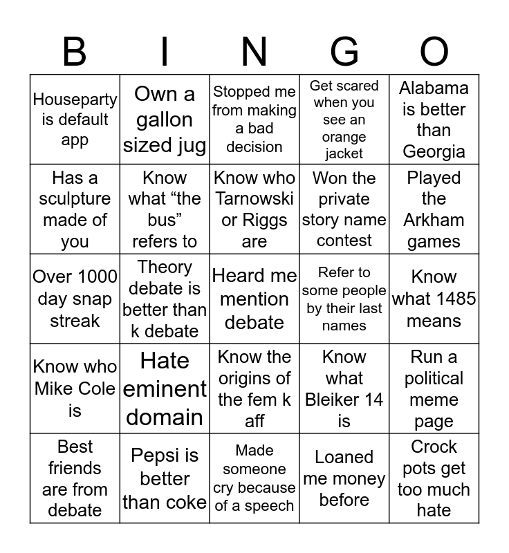 This bingo card has a free space and 24 words: Hate eminent domain, Pepsi is better than coke, Know who Tarnowski or Riggs are, Best friends are from debate, Alabama is better than Georgia, Houseparty is default app, Has a sculpture made of you, Own a gallon sized jug, Refer to some people by their last names, Know the origins of the fem k aff, Won the private story name contest, Over 1000 day snap streak, Know what Bleiker 14 is, Run a political meme page, Know what “the bus” refers to, Loaned me money before, Know what 1485 means, Stopped me from making a bad decision, Played the Arkham games, Theory debate is better than k debate, Crock pots get too much hate, Know who Mike Cole is, Get scared when you see an orange jacket and Made someone cry because of a speech.